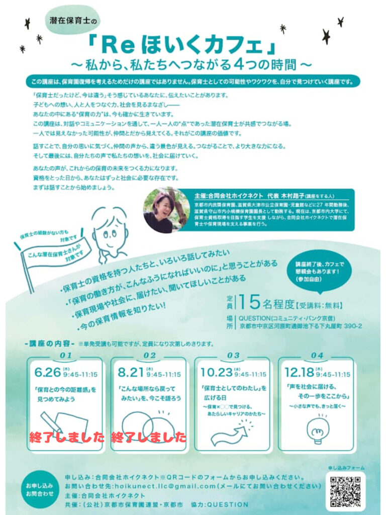 Reほいくカフェは、保育士資格を持ちながら現場を離れている方、そして保育の世界に関心のある方が集まり、対話を通して“保育と自分”のつながりを見つめる連続講座です。